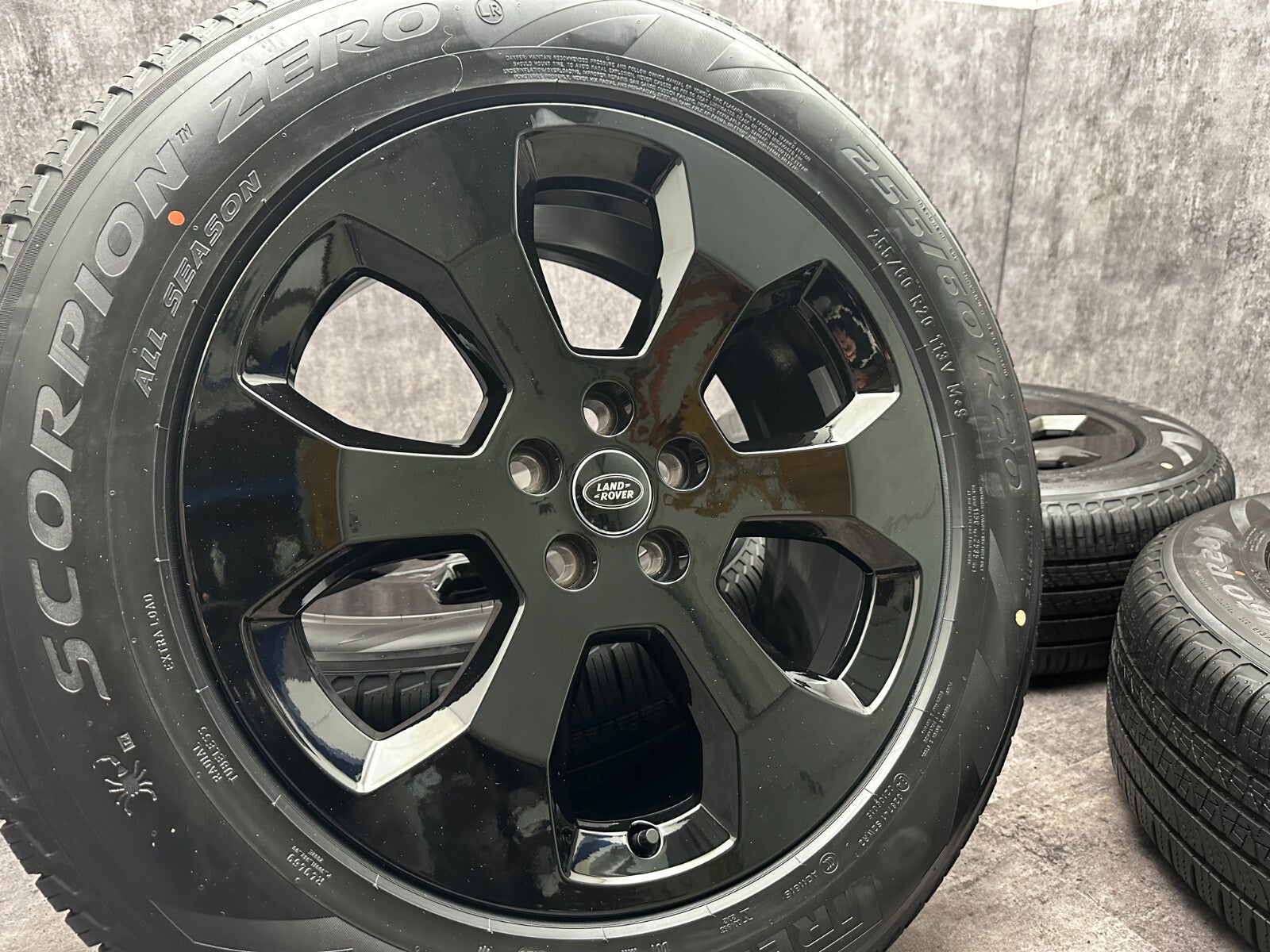 item set of 4 genuine 20" land rover style 6011 alloy wheels fitted with pirelli AS tyres. brand new demounted stock in MINT condition with pimples clearly visible in the pictures taken off a new vehicle and replaced with aftermarket wheels complete with TPMS valves and LR center caps. FREE fitting here in Bedforshire must know UK delivery international delivery - important info please enquire with a full address and your EORI number before you purchase. trust