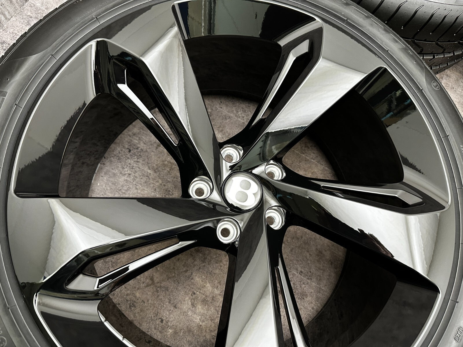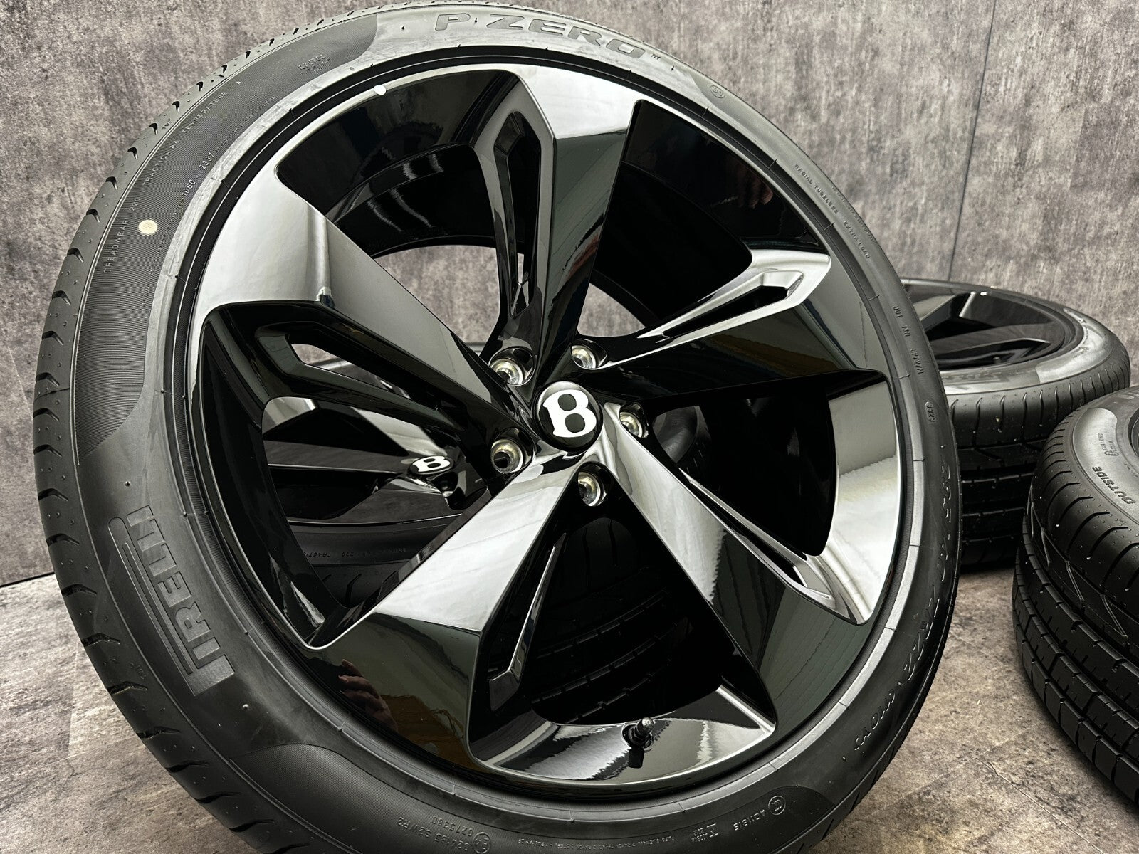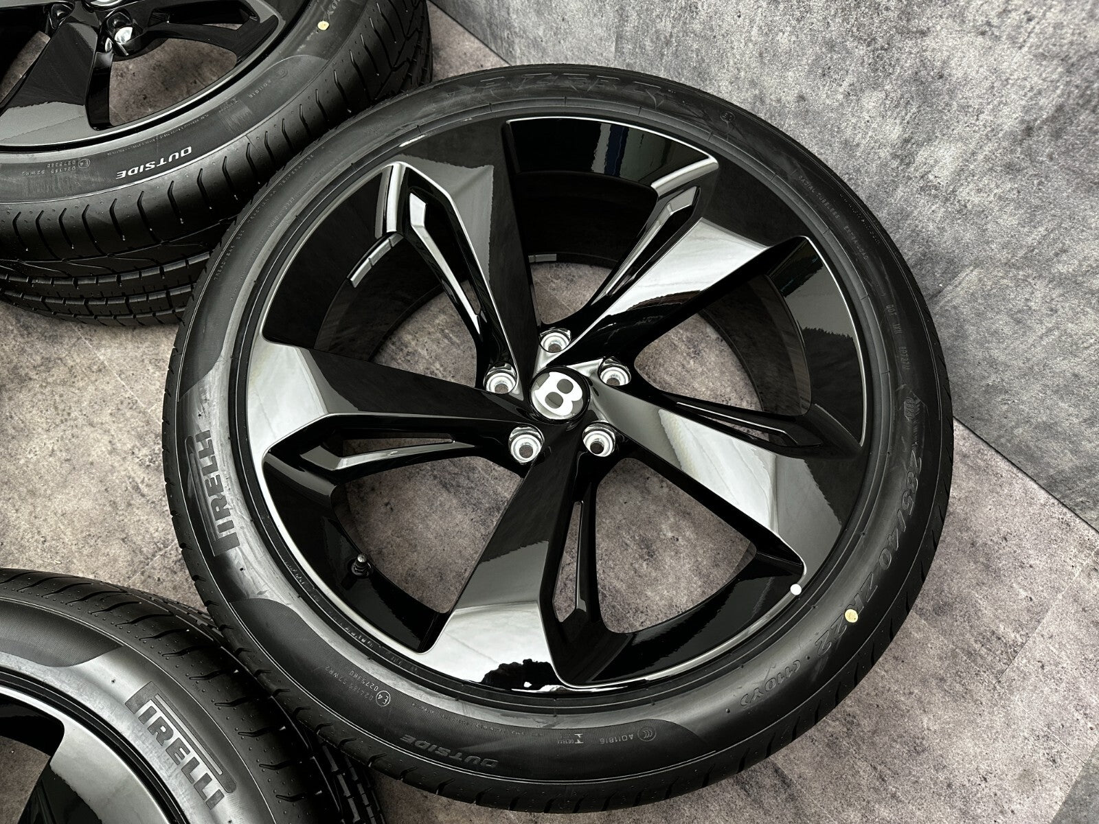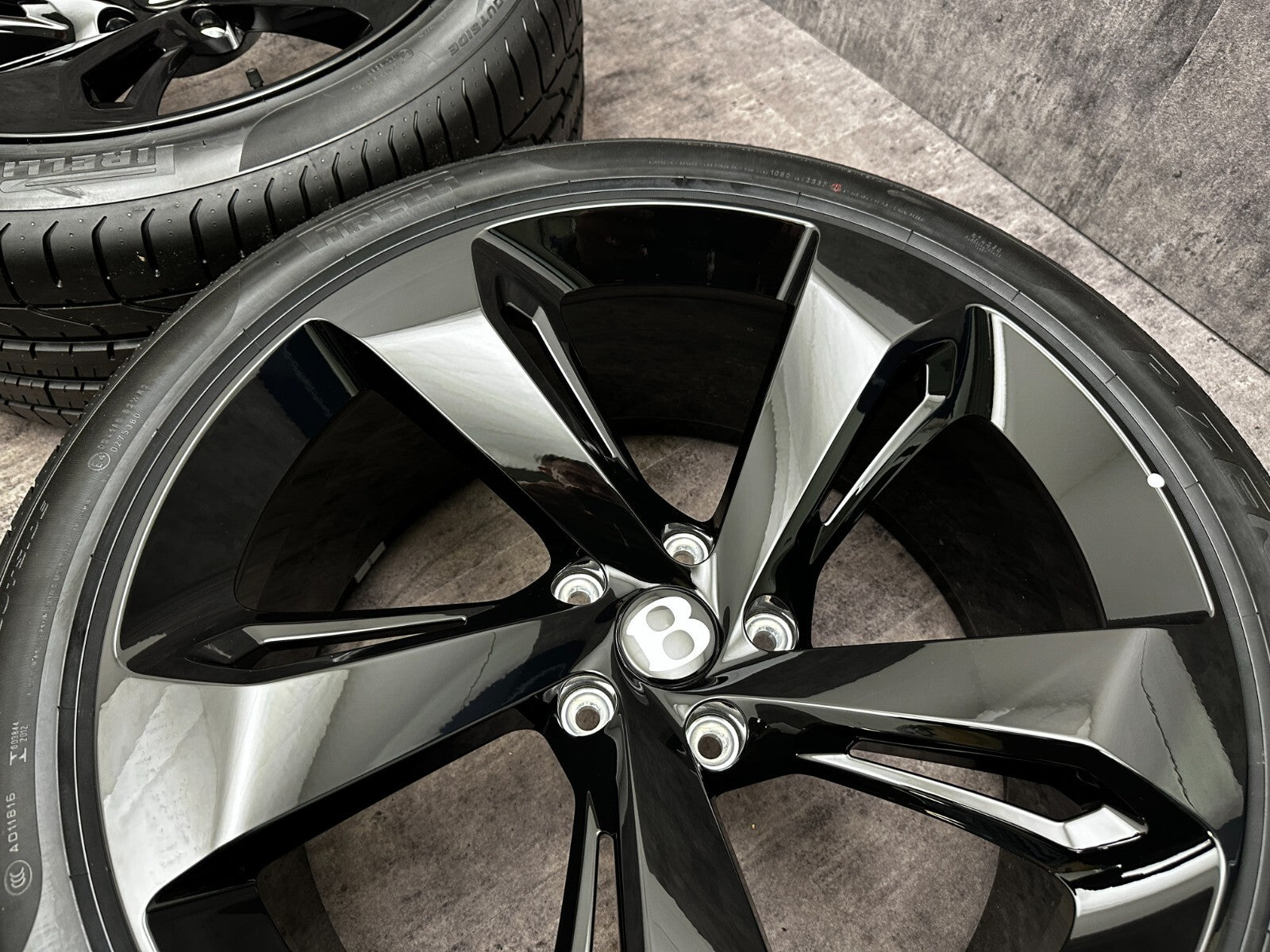 item set of 4 genuine 22" bentley bentayga mulliner directional alloy wheels in gloss black with the correct (B1) bentley approved pirelli tyres fitted. TPMS and centre caps also included never been fitted to a vehicle