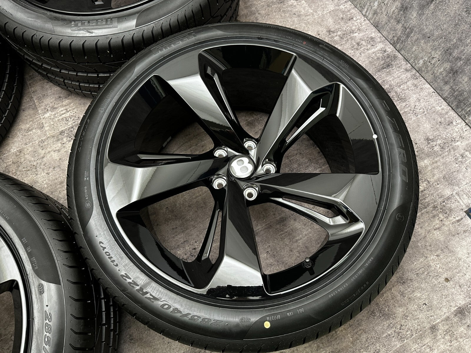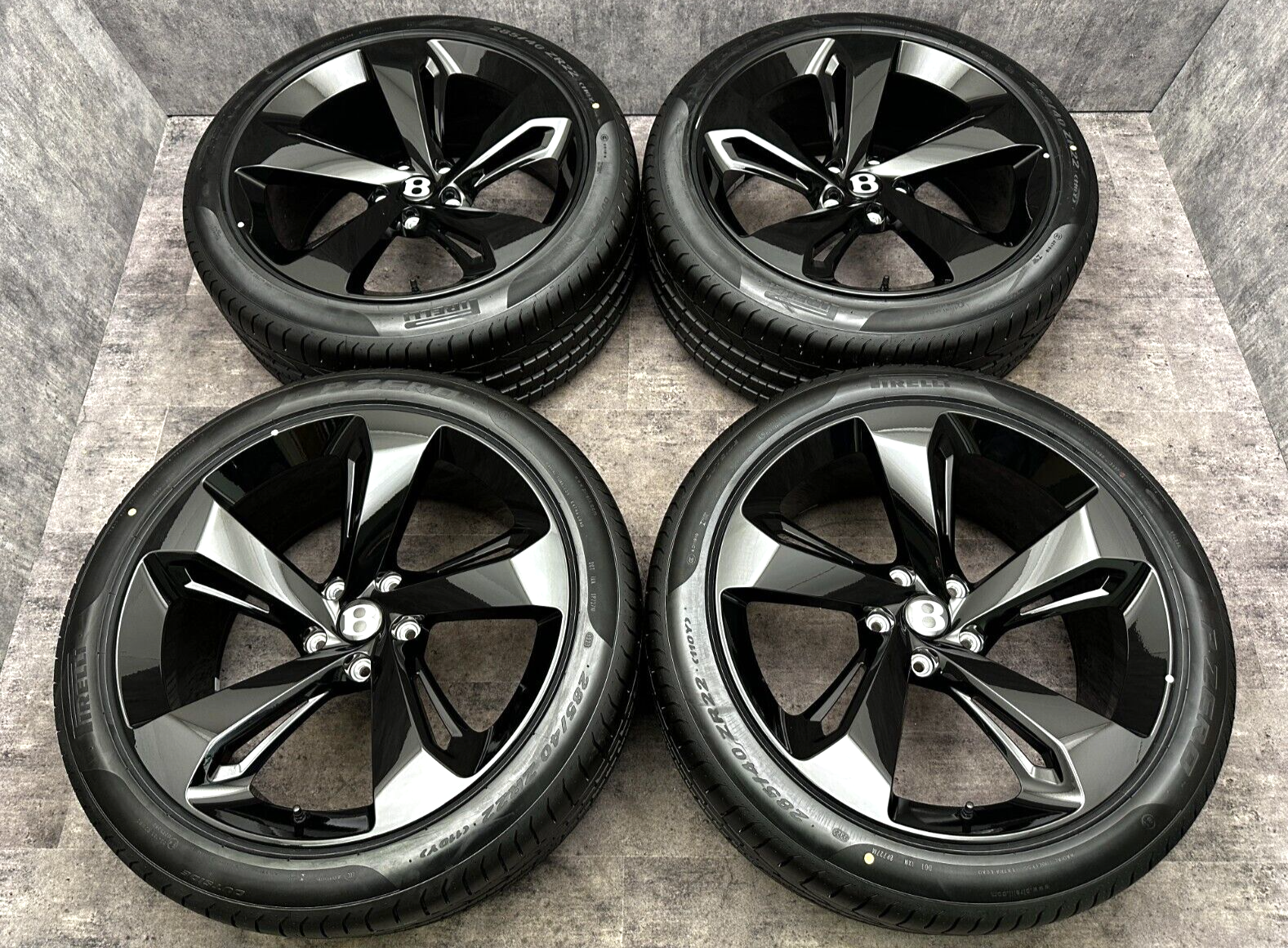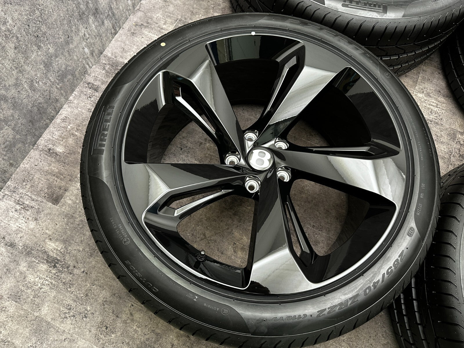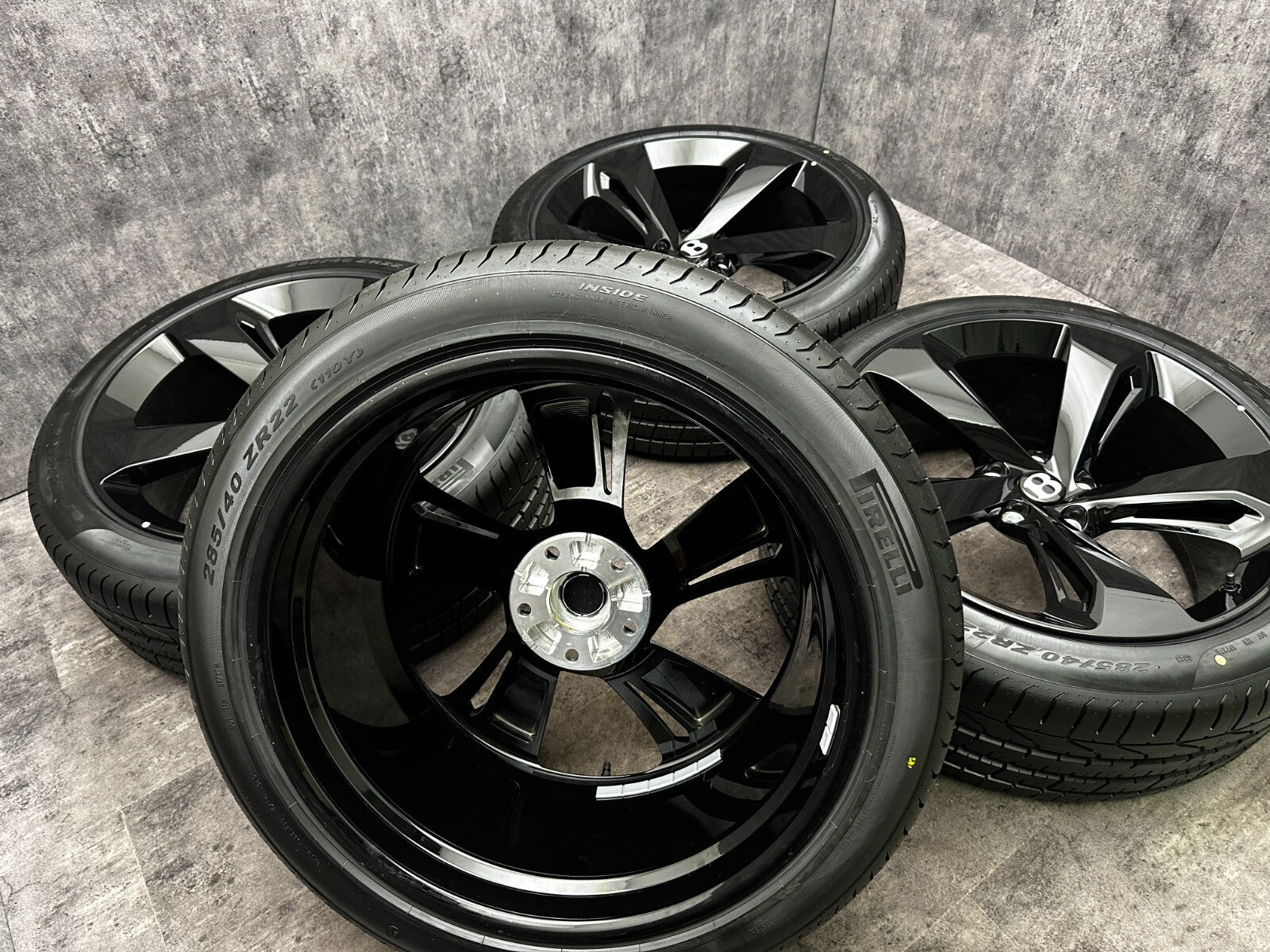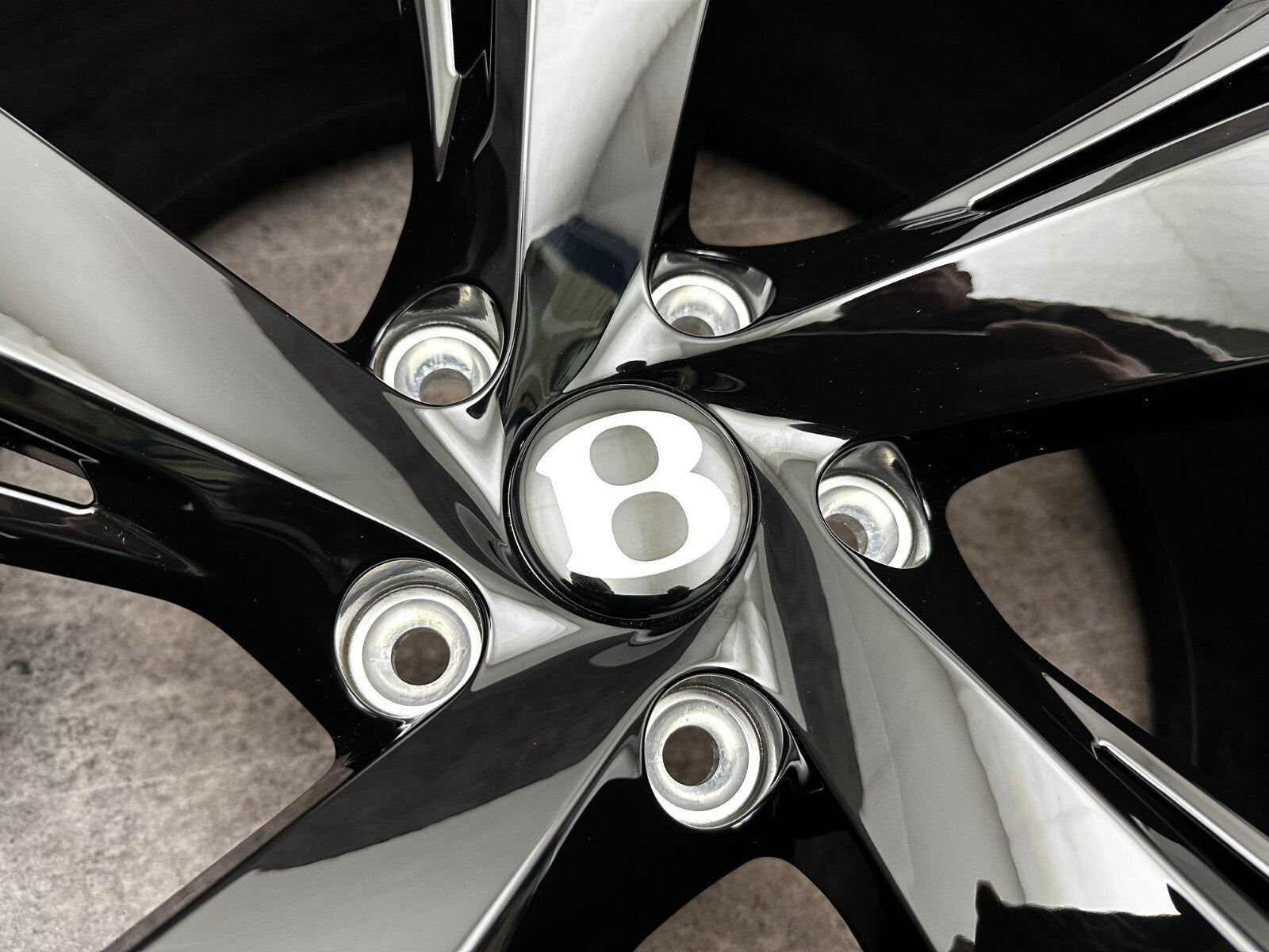 item set of 4 genuine 22" bentley bentayga mulliner directional alloy wheels in gloss black with the correct (B1) bentley approved pirelli tyres fitted. TPMS and centre caps also included never been fitted to a vehicle