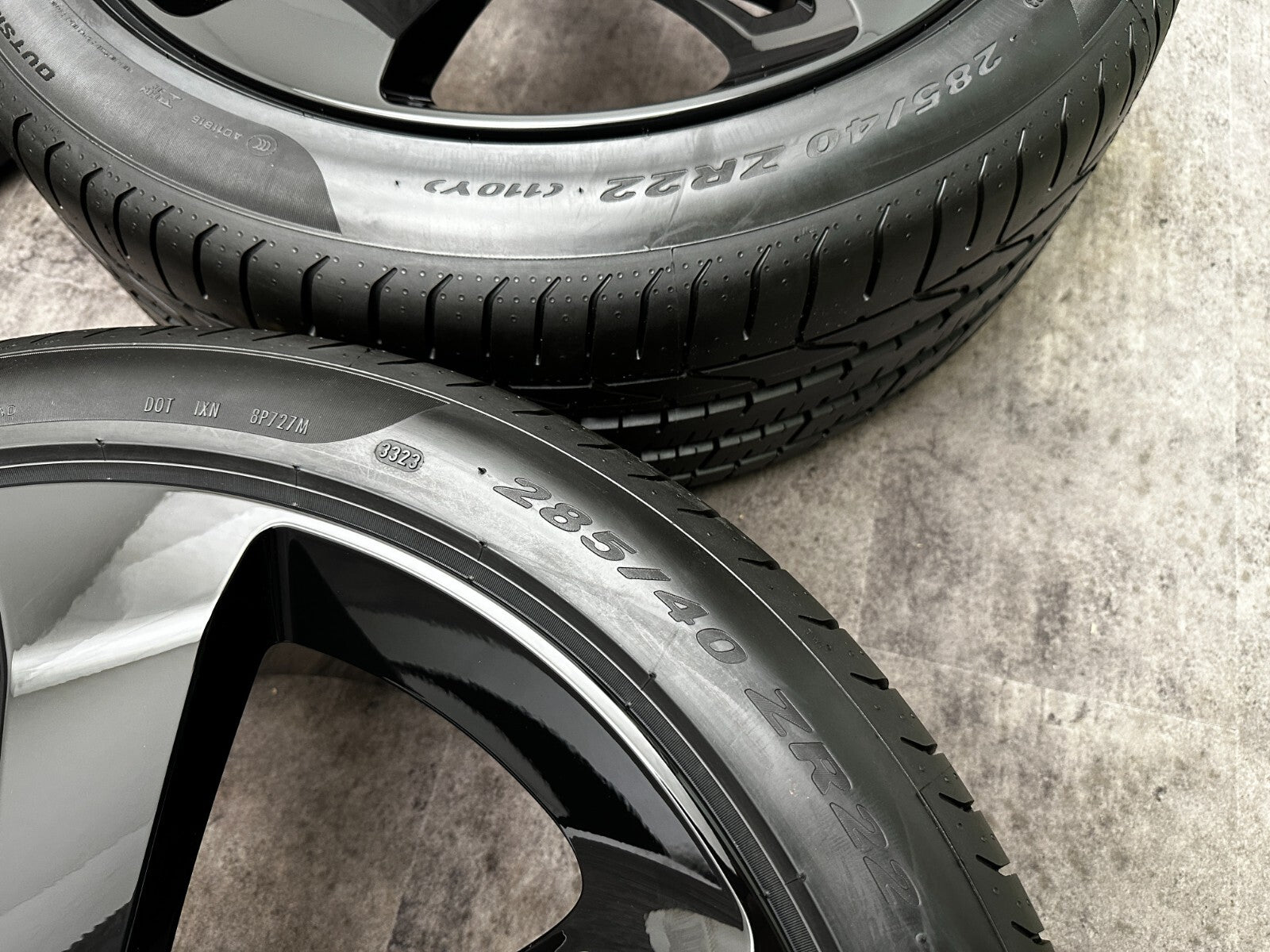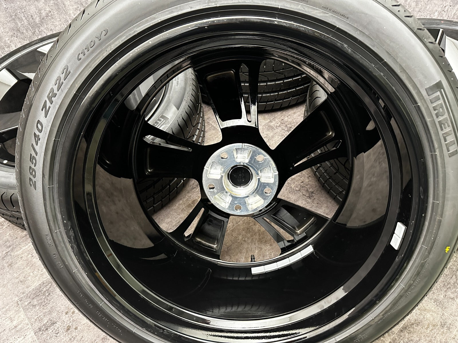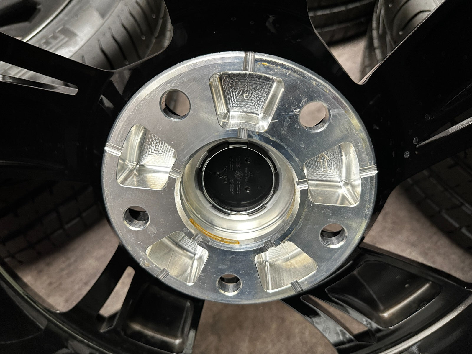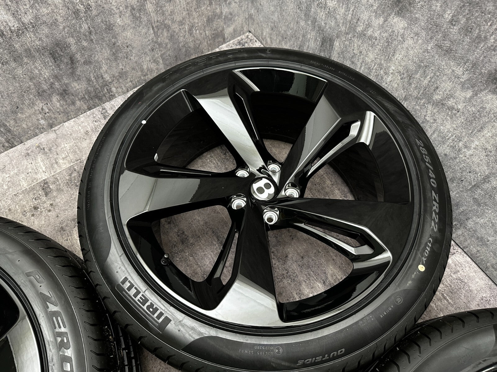 item set of 4 genuine 22" bentley bentayga mulliner directional alloy wheels in gloss black with the correct (B1) bentley approved pirelli tyres fitted. TPMS and centre caps also included never been fitted to a vehicle