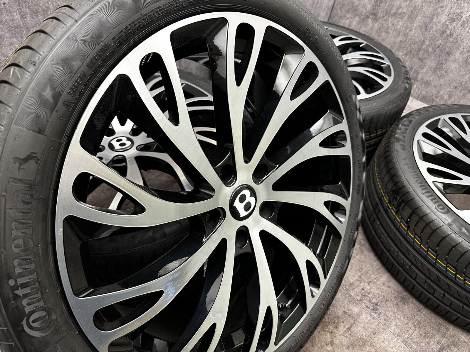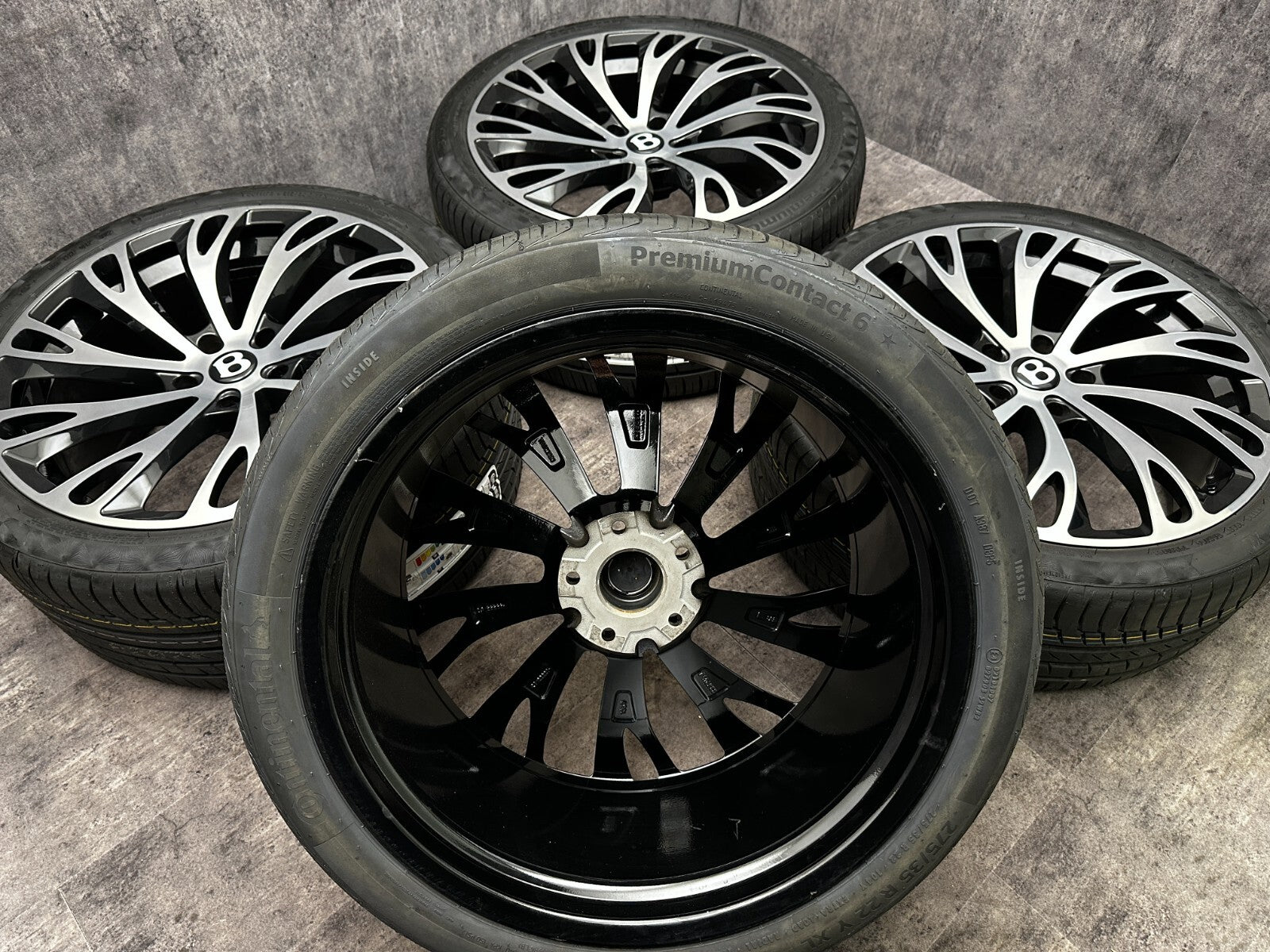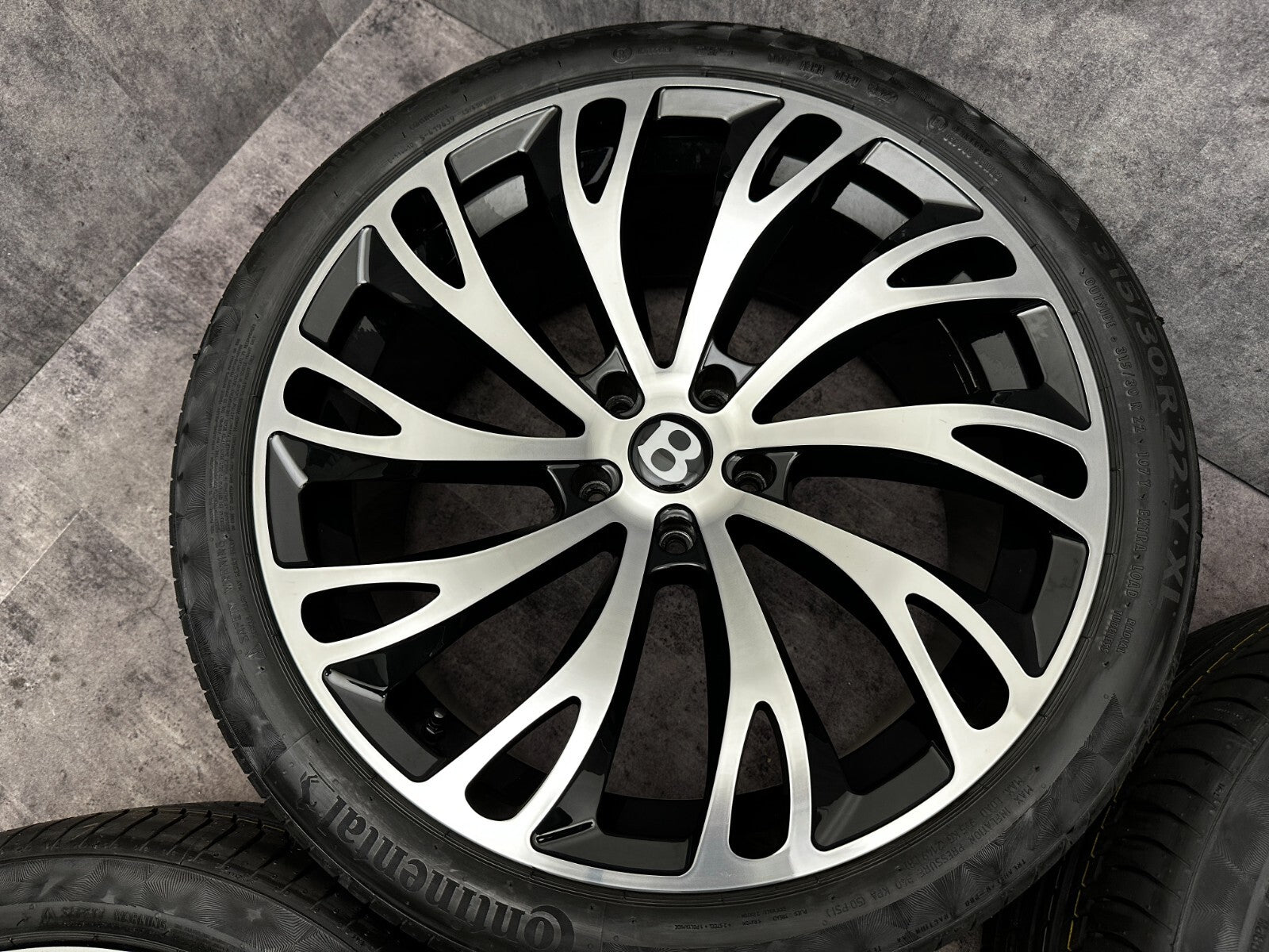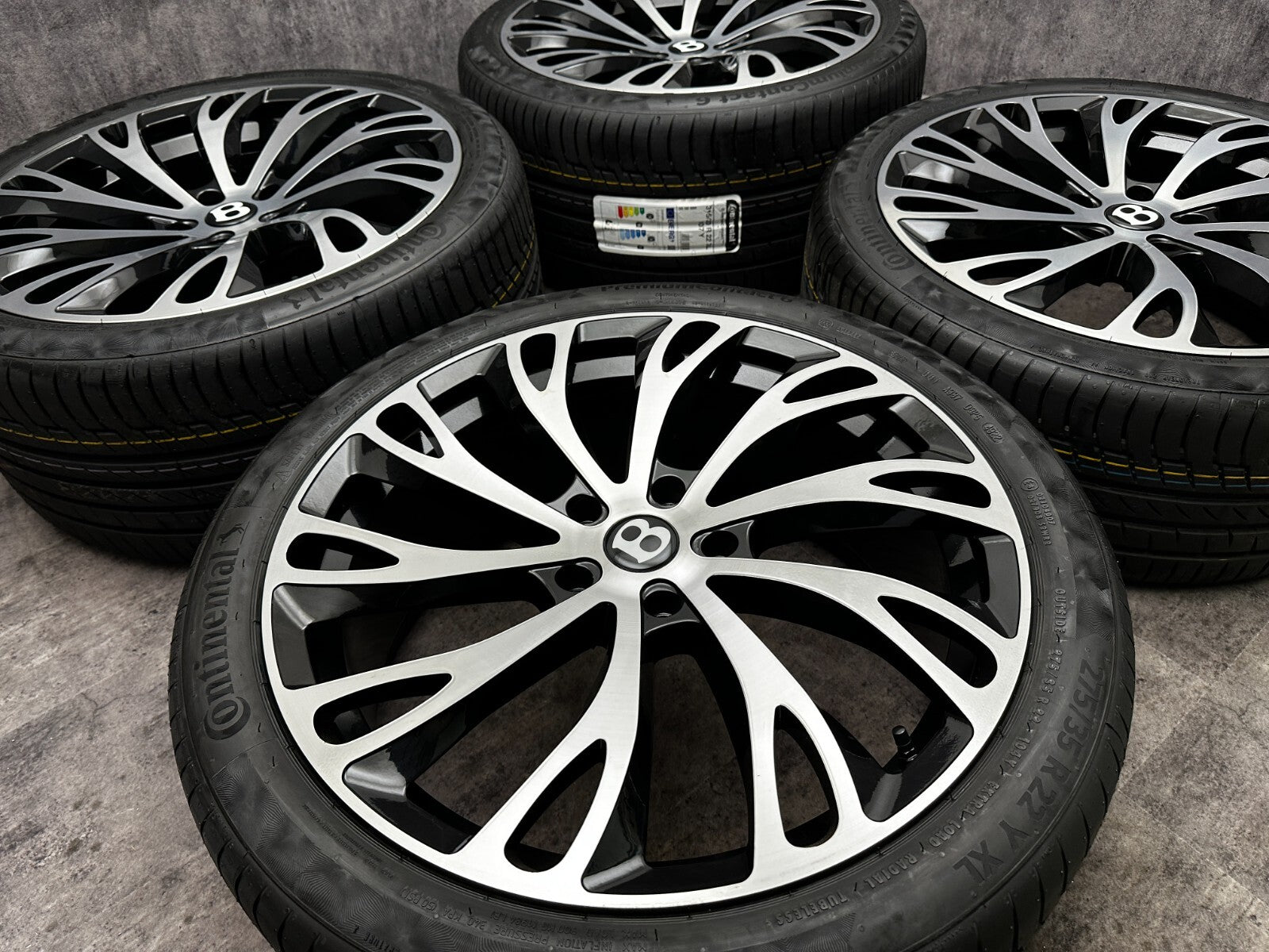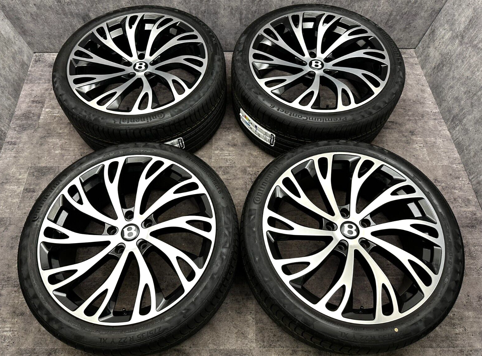 item set of 4 22" bentley gt fitment alloy wheels with continental tyres, genuine bentley center caps & TPMS valves included brand new wheels and tyres finished in gloss black/polish. stunning set of aftermarket wheels designed to fit the current model GT/GTC (will not fit the earlier models). this set has a couple of small marks hence crazy price! RRP £4000 + THESE ARE NOT GENUINE BENTLEY - THEY HAVE GENUINE BENTLEY CAPS FOR THAT OEM LOOK.
