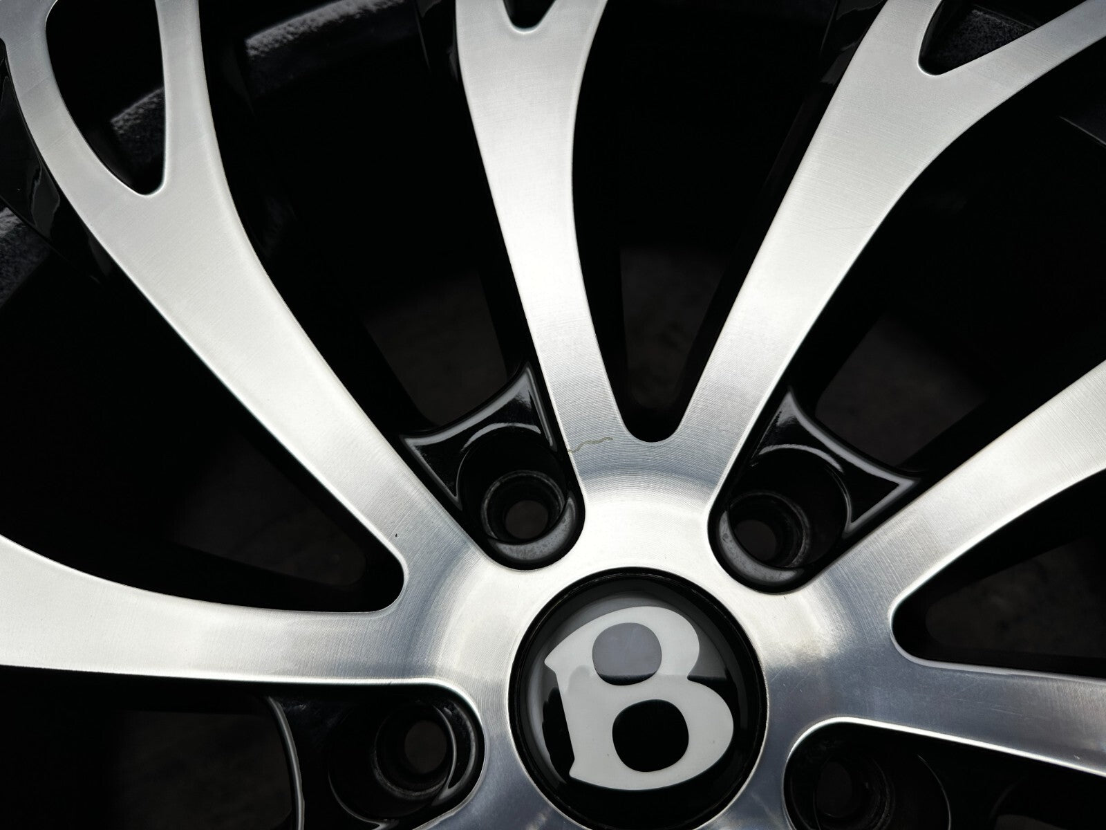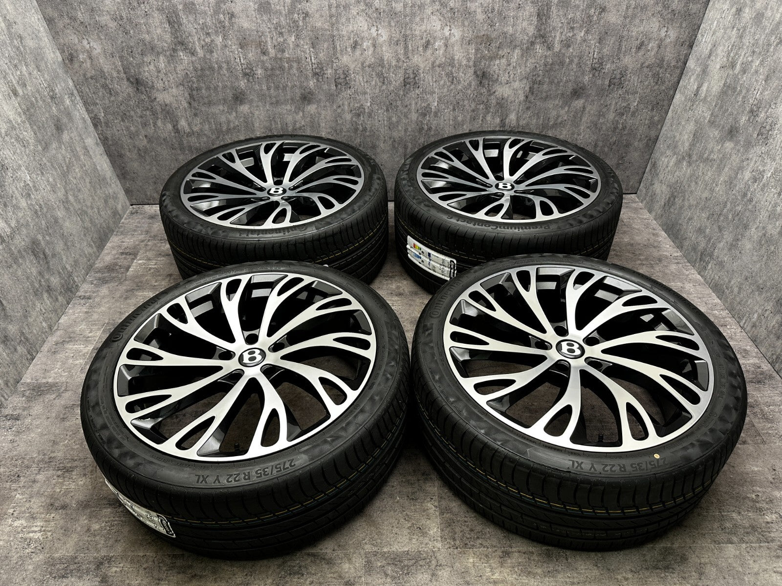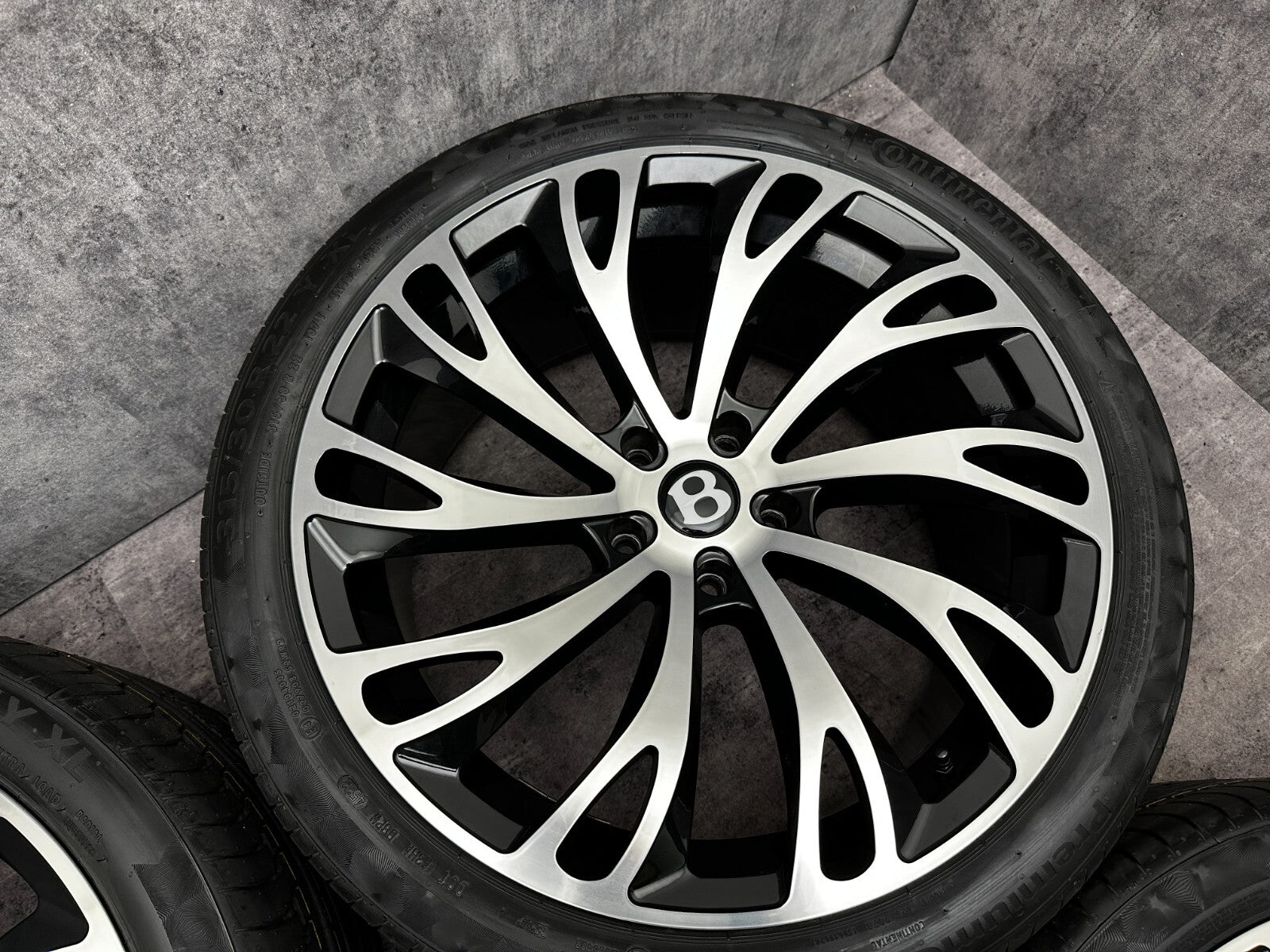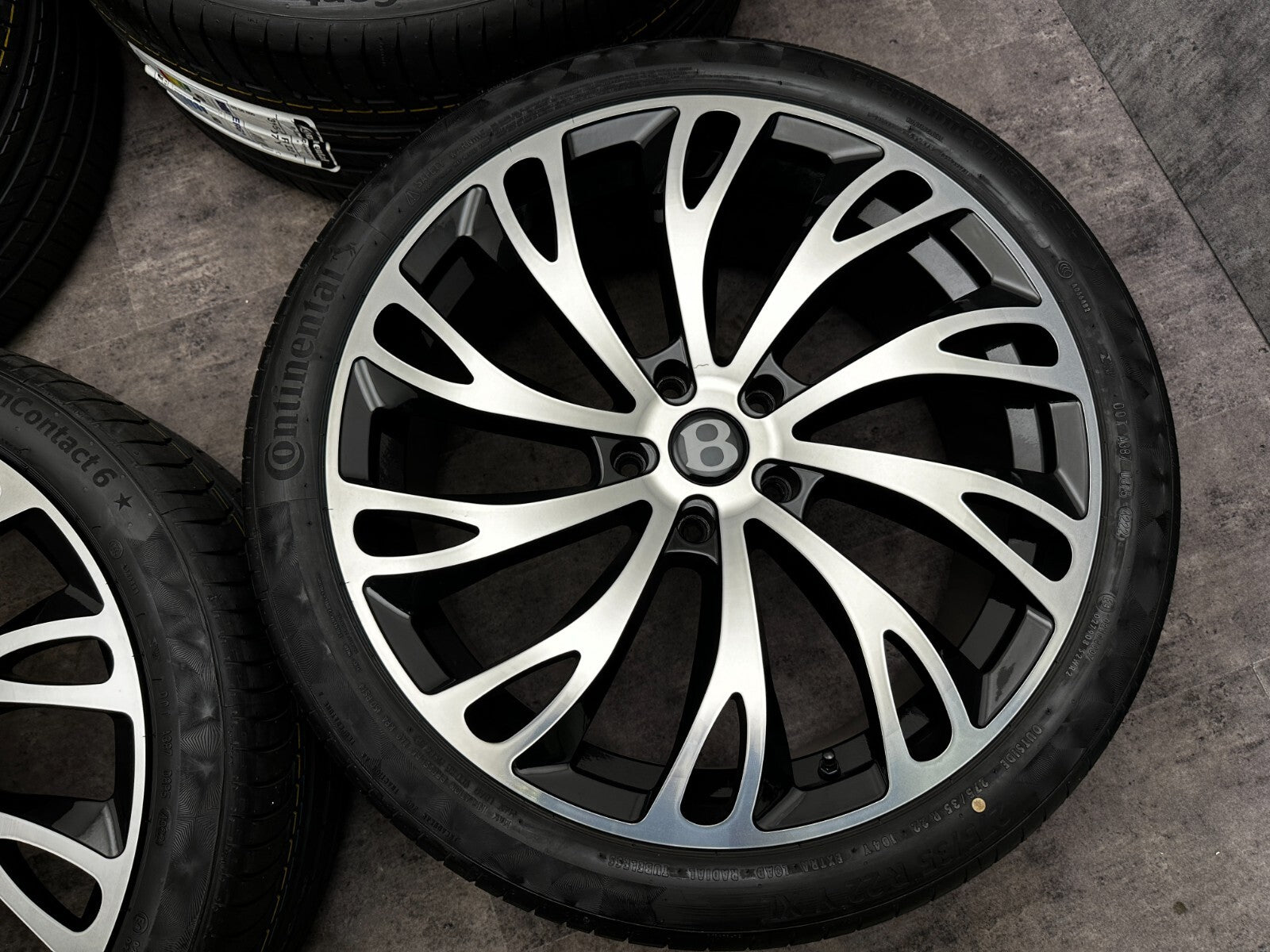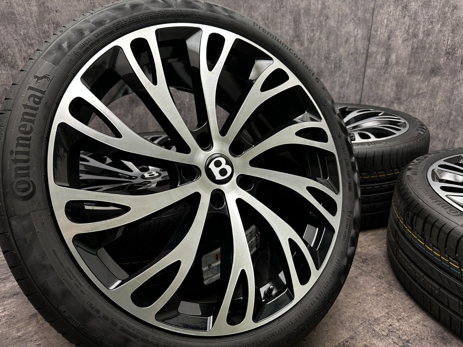 item set of 4 22" bentley gt fitment alloy wheels with continental tyres, genuine bentley center caps & TPMS valves included brand new wheels and tyres finished in gloss black/polish. stunning set of aftermarket wheels designed to fit the current model GT/GTC (will not fit the earlier models). this set has a couple of small marks hence crazy price! RRP £4000 + THESE ARE NOT GENUINE BENTLEY - THEY HAVE GENUINE BENTLEY CAPS FOR THAT OEM LOOK.