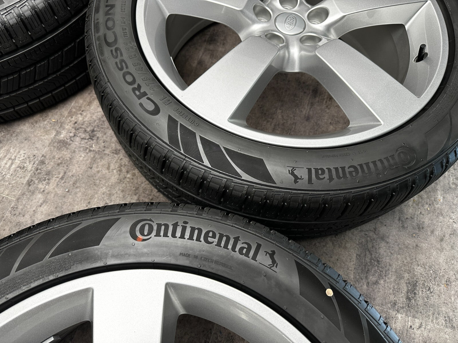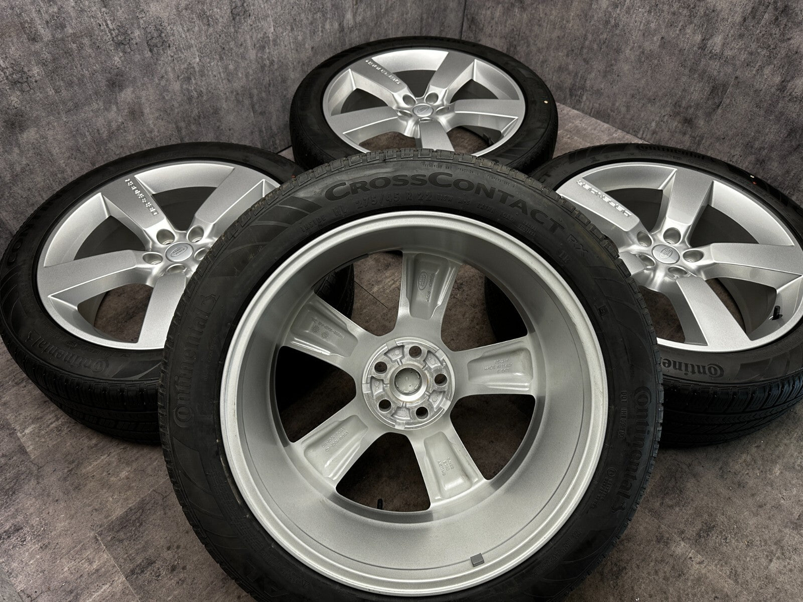 set of 4 genuine 22" land rover style 5098 alloy wheels fitted with continental RX tyres.